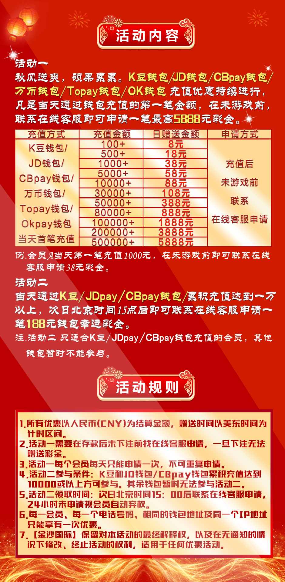 金沙国际【www.89068a.com】新老会员凡是通过公司入款通道进行充值,即可享有最高贴心回馈存款优惠红利5%