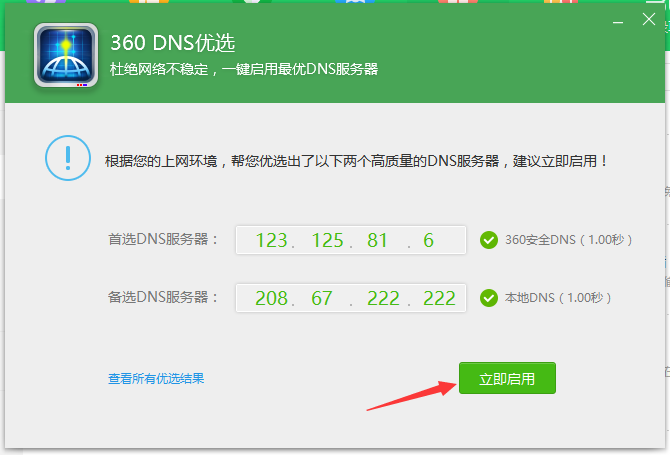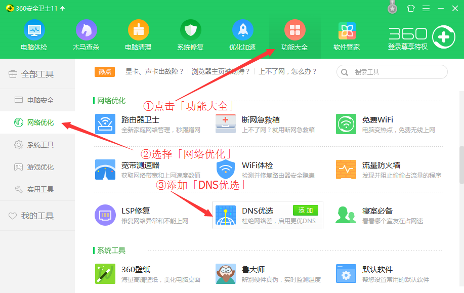 如您不放心,请使用方案②方案② – 使用「360DNS优选」,打开360卫士,根据以下图示操作:
